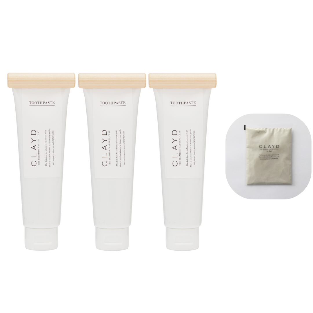 〈公式ウェブストア限定お得なまとめ買いセット〉TOOTH PASTE3本と、クレイパウダー(30g)1袋。